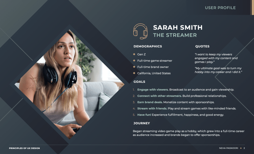 To conclude, making these two comprehensive personas proved to be fruitful. I’ve had this dream of becoming a streamer for a while now, and I even starting creating streaming assets and other such content. This exercise allowed me to explore the motivations, goals, and pain points of two very different user types, as well as understand both a bit better.