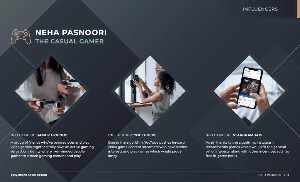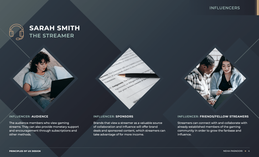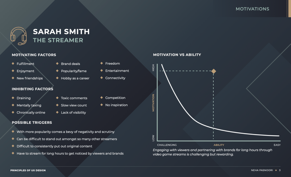 For the second comprehensive person – The Streamer – I had to put myself in the shoes of all the video game streamers I’ve watched over the years, and issues they’ve faced regarding their streaming careers. Many high-profile streamers with millions of subscribers share similar pain points such as cyberbullying, toxicity, and long hours spent staring at a screen. I summarized all of those findings into this singular persona. With further research, such as interviews with real streamers, I believe that I’d get even more insight in streamer lifestyle. I think that the shift from viewing games as simply a hobby into making them a real career requires a lot of personal adjustments, but can also afford for more freedom and independence.