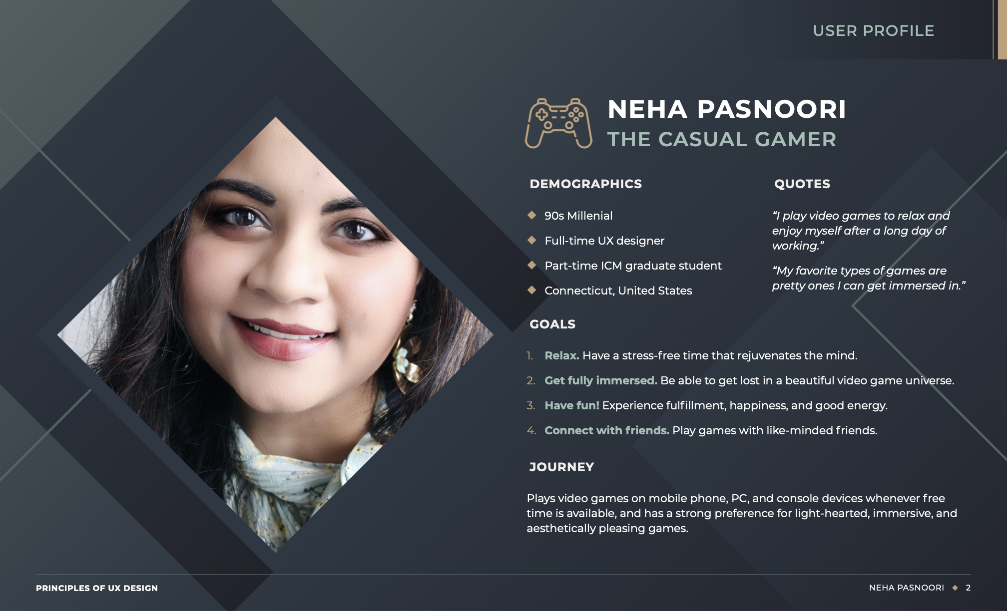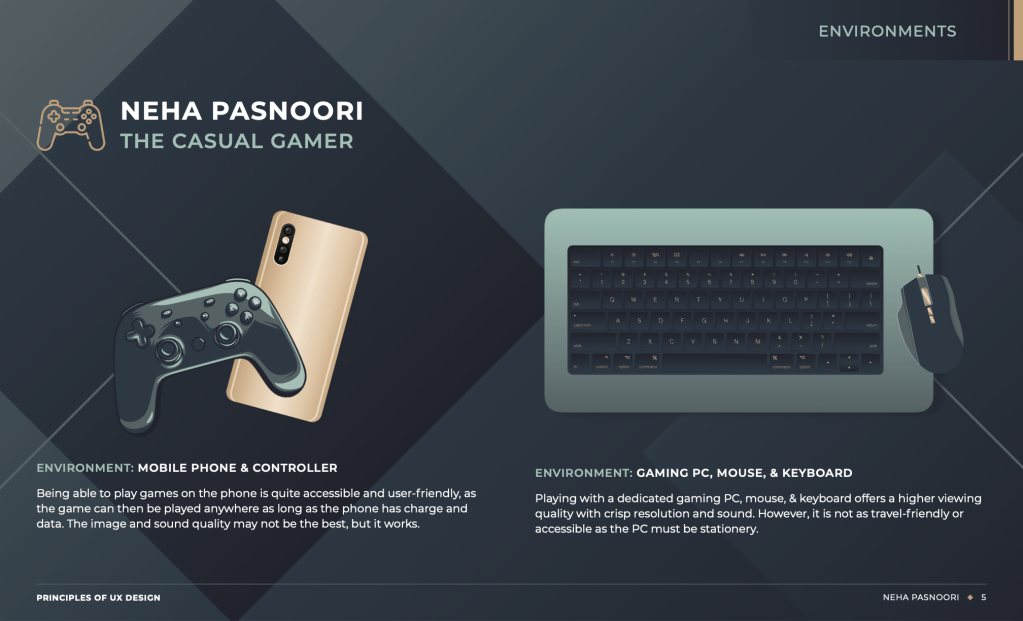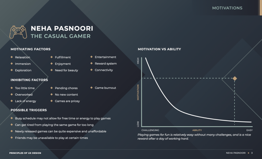 Creating The Casual Gamer persona was an exercise in self-assessment. I sat and figured out why exactly I played games, what motivates me as a gamer, and what pain points I experience when I play games for fun. I discovered some things about myself that I never realized, such as my proclivity to burn out from excessively playing the same game, and a need for variety. I realized that I may need to extend my gaming horizons and try other genres! For my pain points regarding lack of time time, I found that this could be resolved by planning my time out better and allowing myself more breaks (as I tend to work more than play).