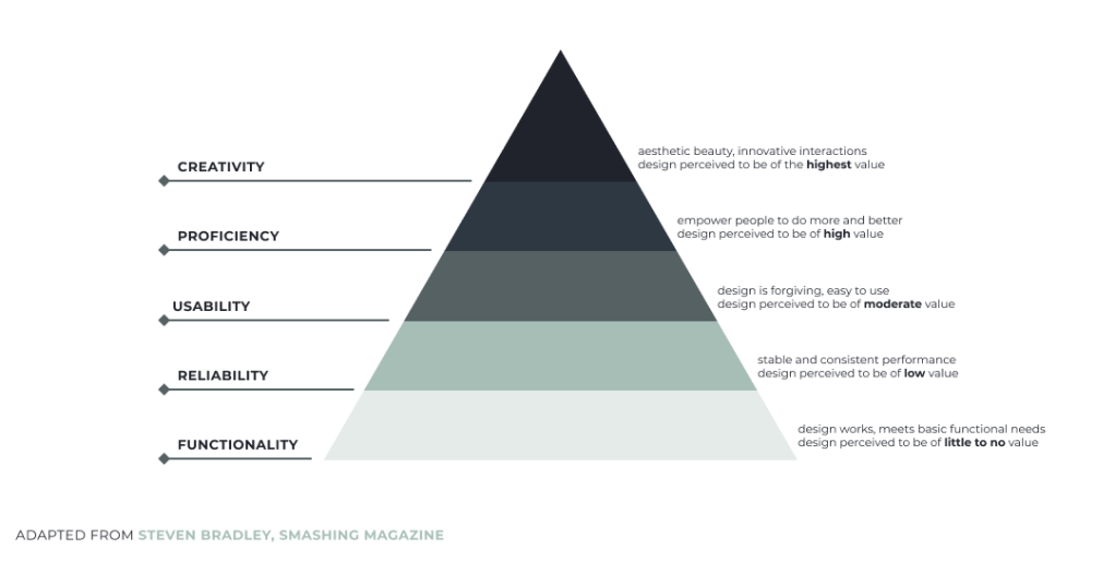 In addition, just as Maslow’s Hierarchy of Needs exists, a Design Hierarchy of Needs has also been established by Steven Bradley in 2010, further cementing the principle that UX design follows scientific principles (similar to psychology). In this hierarchy, a design must meet the basic requirements at the bottom of the pyramid before moving on up the tiers. Fulfilling the creativity requirement is considered the highest tier, thus incorporating it into design work allows the interface to have highest value.