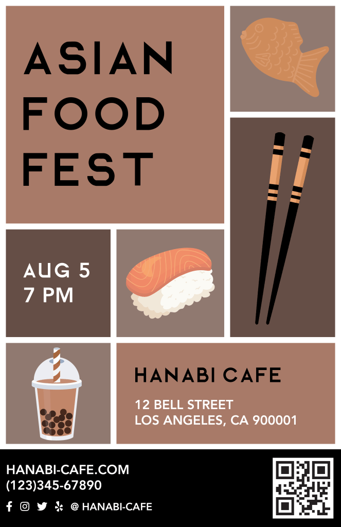 Another color exploration was to create three variations of the same event poster. I made up an imaginary event at and imaginary café for this, and used a fun, almost pop art style for the general layout. Since I was working with food, I wanted the colors to stimulate the appetite. According to color psychology, colors such as purple and blue suppress the appetite, whereas browns, reds, oranges, and yellows whet it. Thus, those are the color schemes I decided on and went with.
