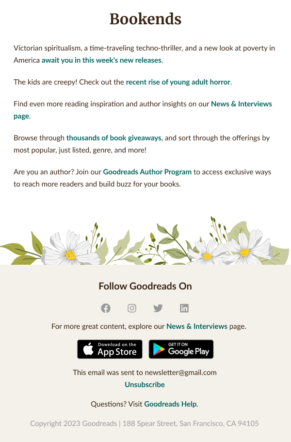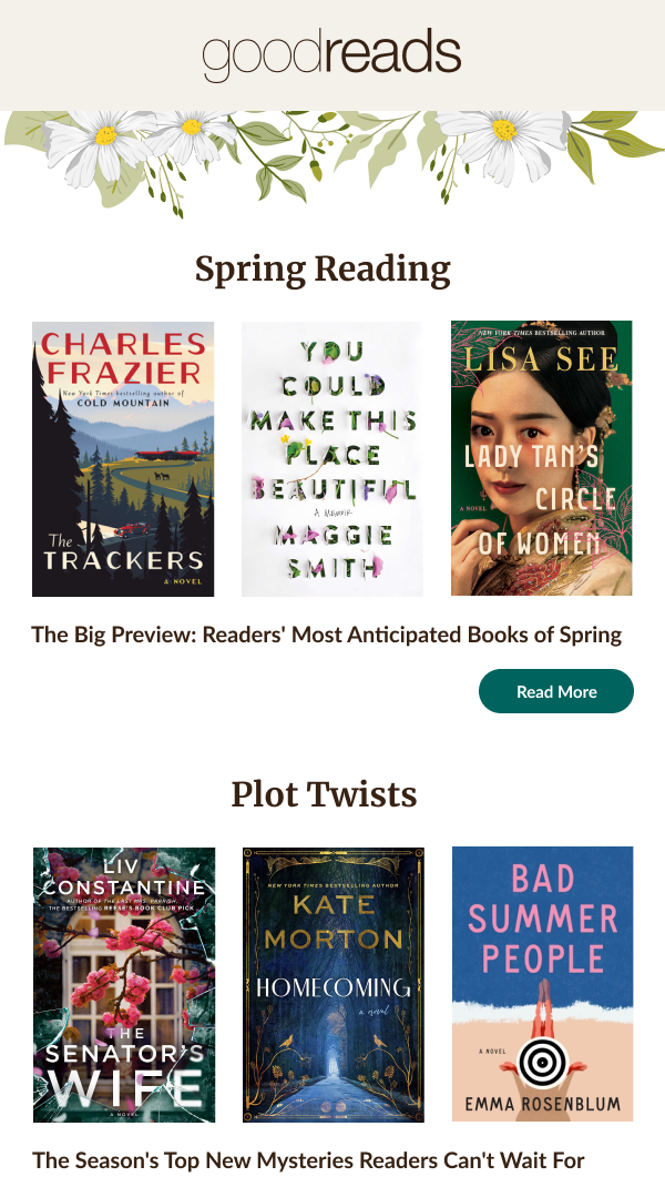 The Goodreads Newsletter was already well designed with well spaced text and appropriate imagery. However, I wanted more attention to be on the books rather than clipart, so I used solely the graphics of the books for each section, and then appended a simple flower clipart to the header and footer to signify the main subject of the newsletter – Spring.