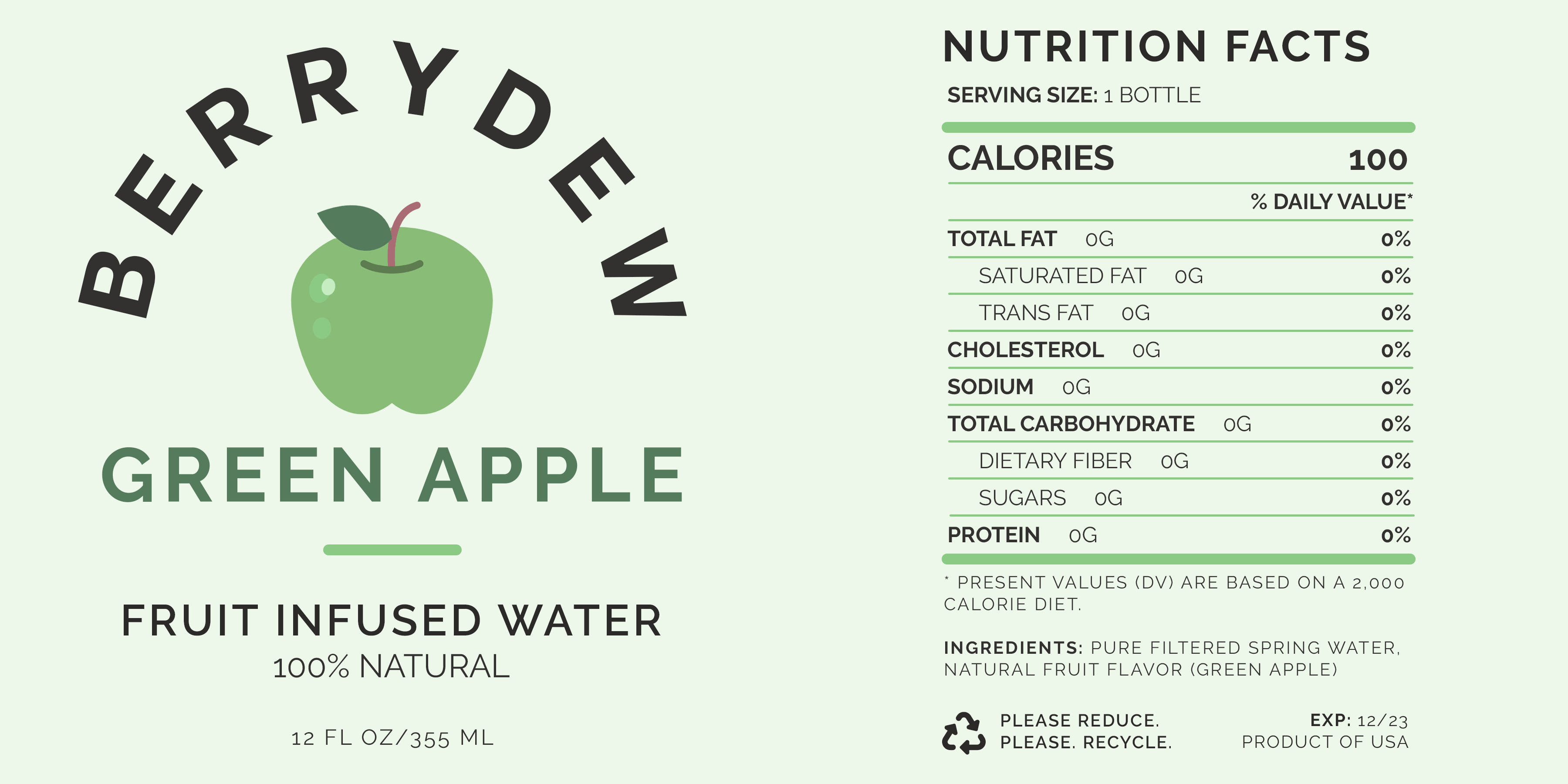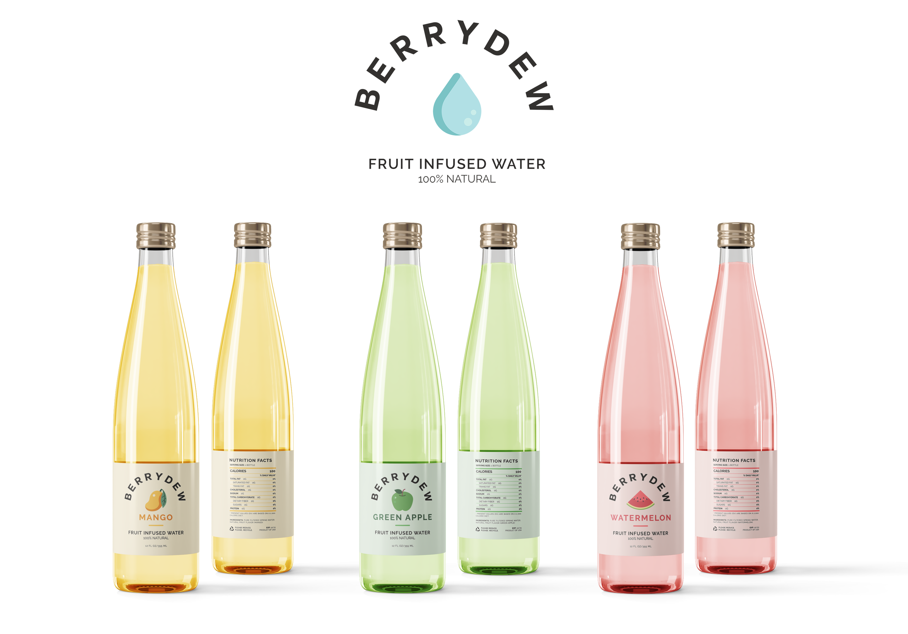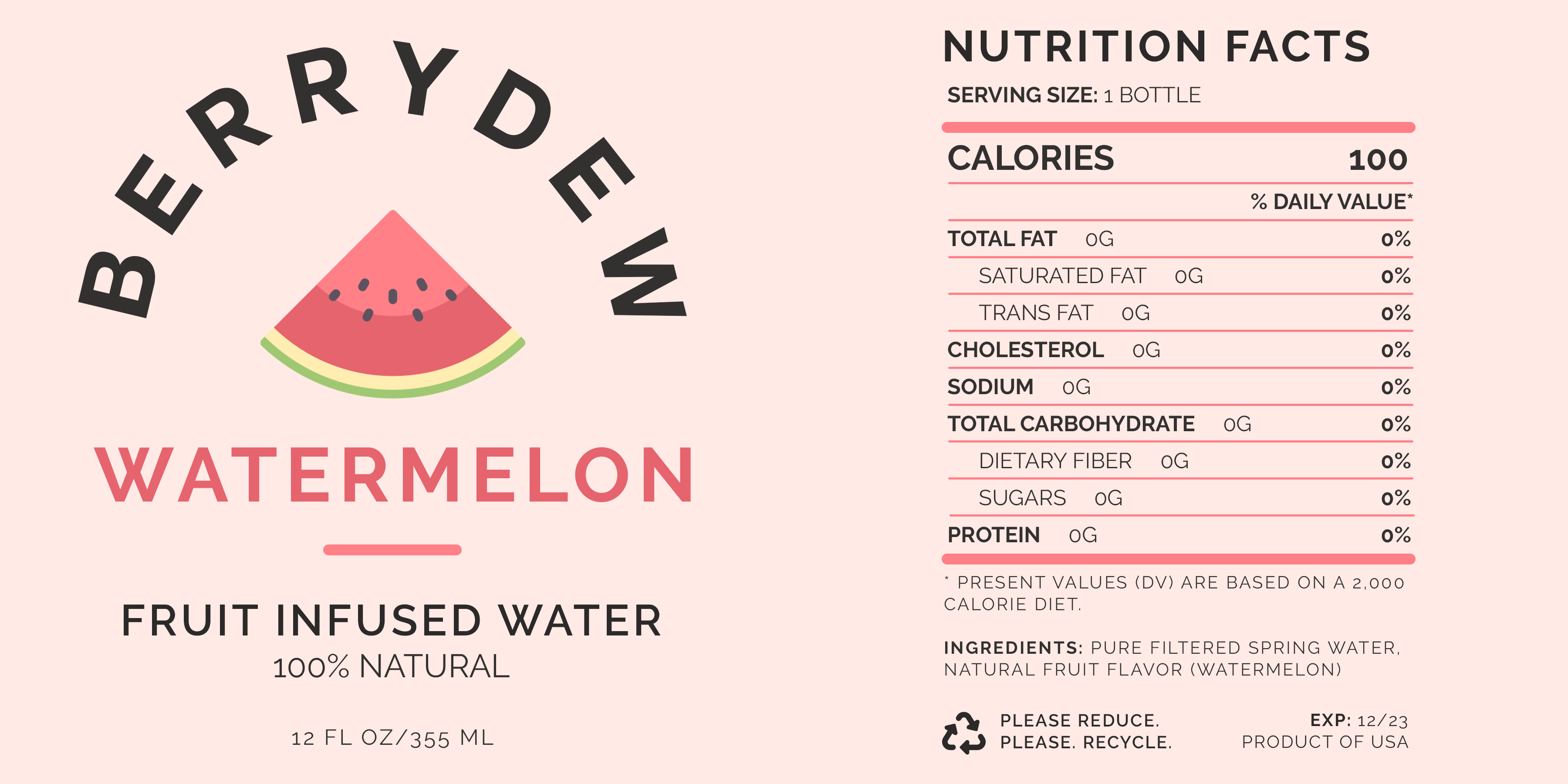 Lastly, I designed a series of packaging labels for fruit infused water by the imaginary brand – Berrydew. I played off of the colors of the fruit clipart illustrations and kept everything else simple and clean. I also wanted the hue of the water to indicate the flavor of the water (going back to my previous exercise with color), so I chose appetizing pastel sherbet shades. To add a little bit more extra pizazz, I changed the color of the water bottle caps to a light champagne gold.