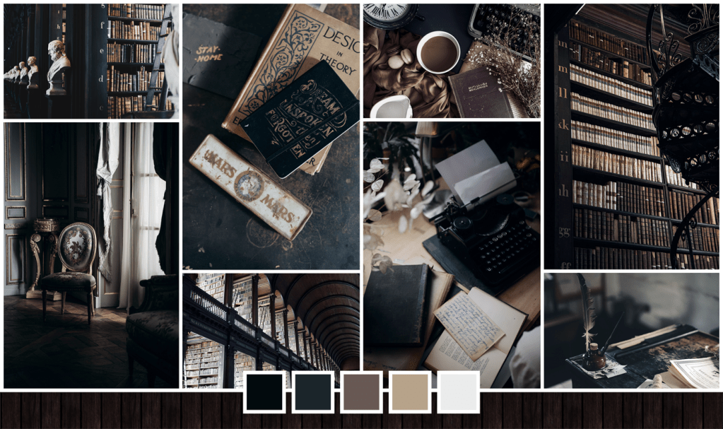 For my first experimentation with imagery, I created three photo boards. I first chose three establishments – a library, a clothing boutique, and a café. Then I trawled through image resource hubs such as Pexels and Unsplash to find the images I thought best fit the aesthetic I was going for. After I found a variety of images, I arranged them in a masonry grid format and added corresponding color palettes to each.