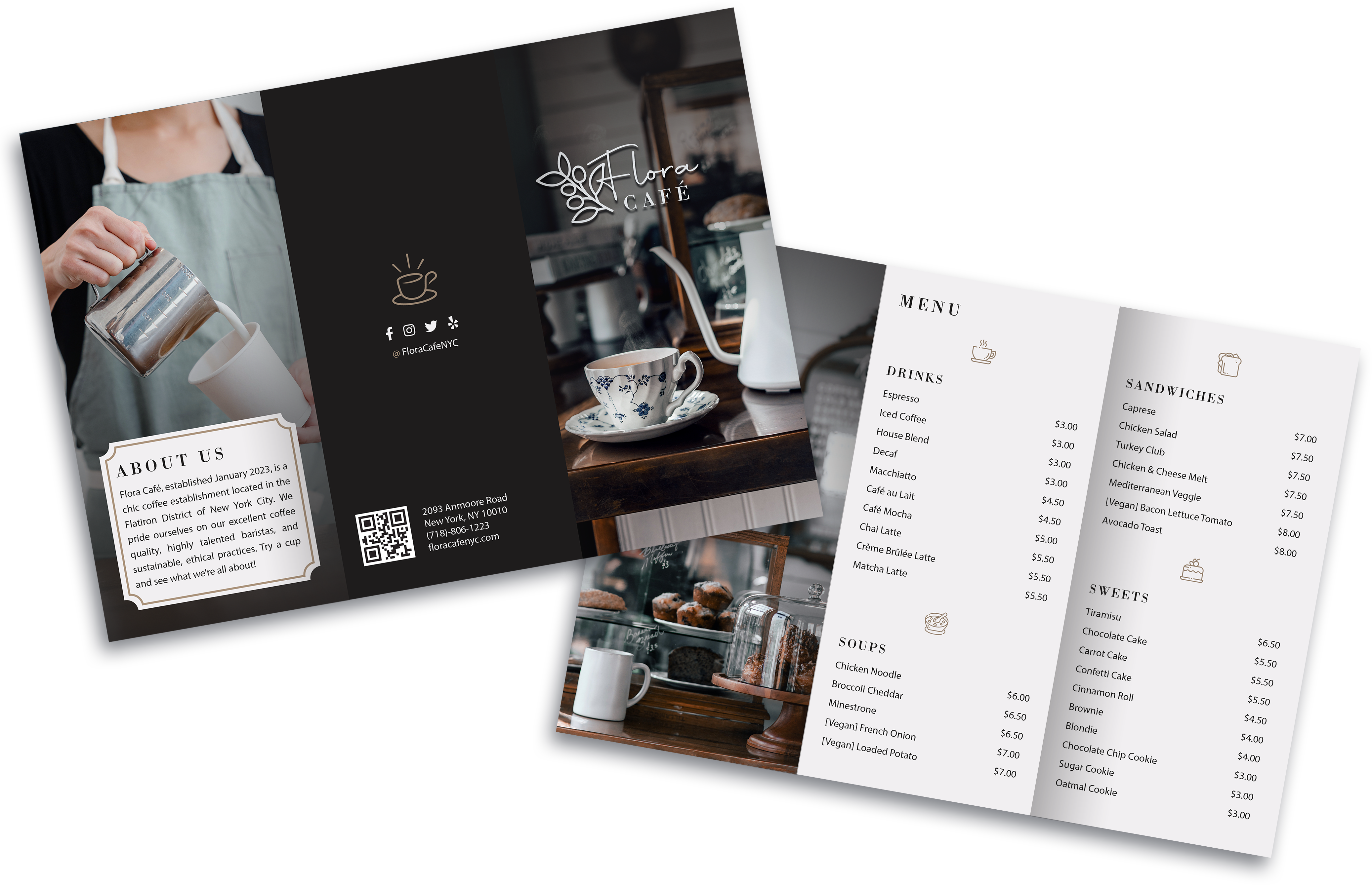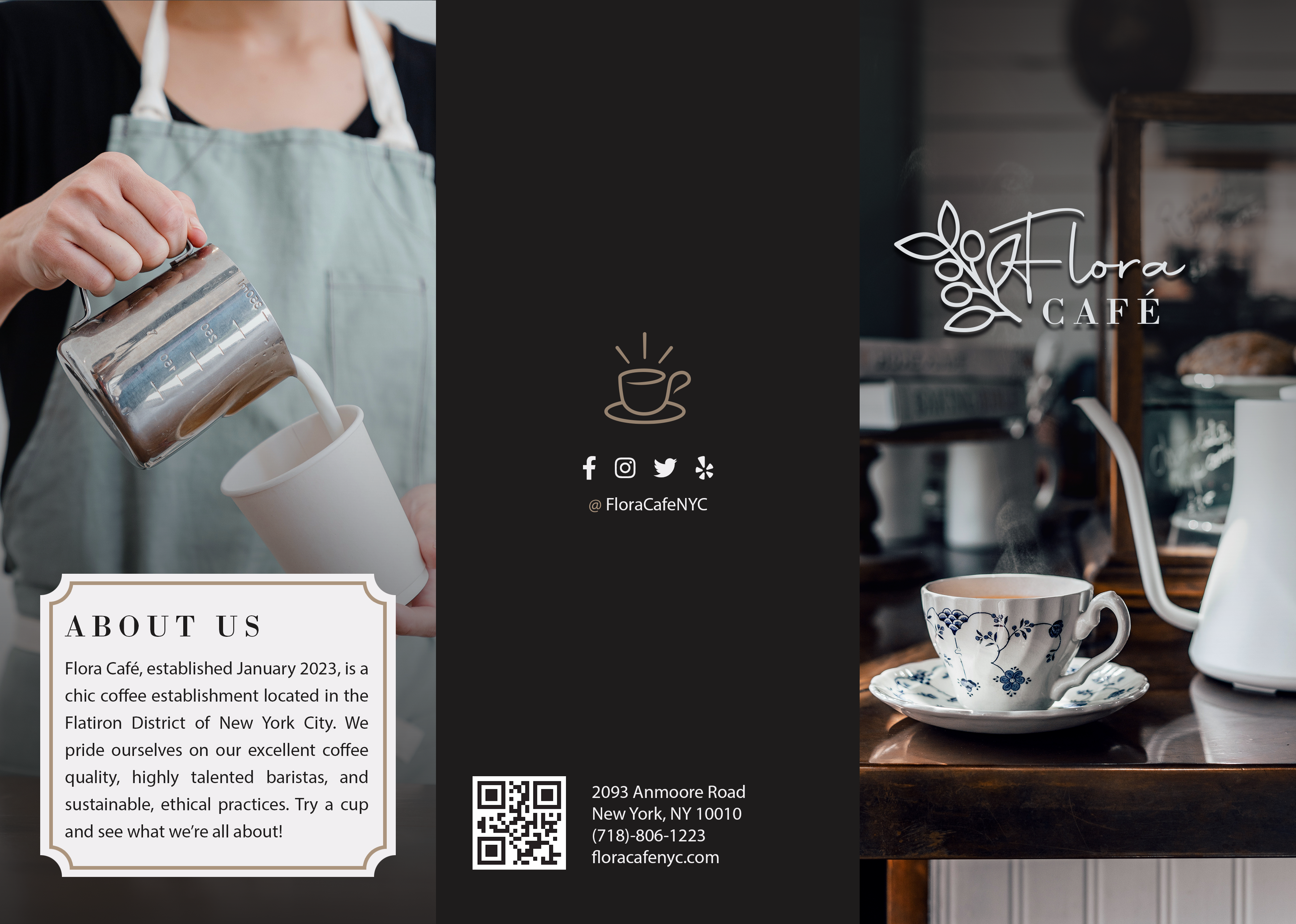 In my next experiment, I took inspiration from the photo boards I had created previously, and made a tri-fold brochure for an imaginary café in NYC. I carried over the aesthetic style from the photo board – elegant and understated, with calming blues and warm caramel/wood tones. I also selected minimalist iconography that played well with the images.