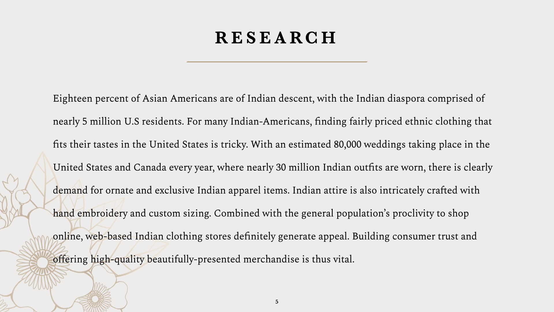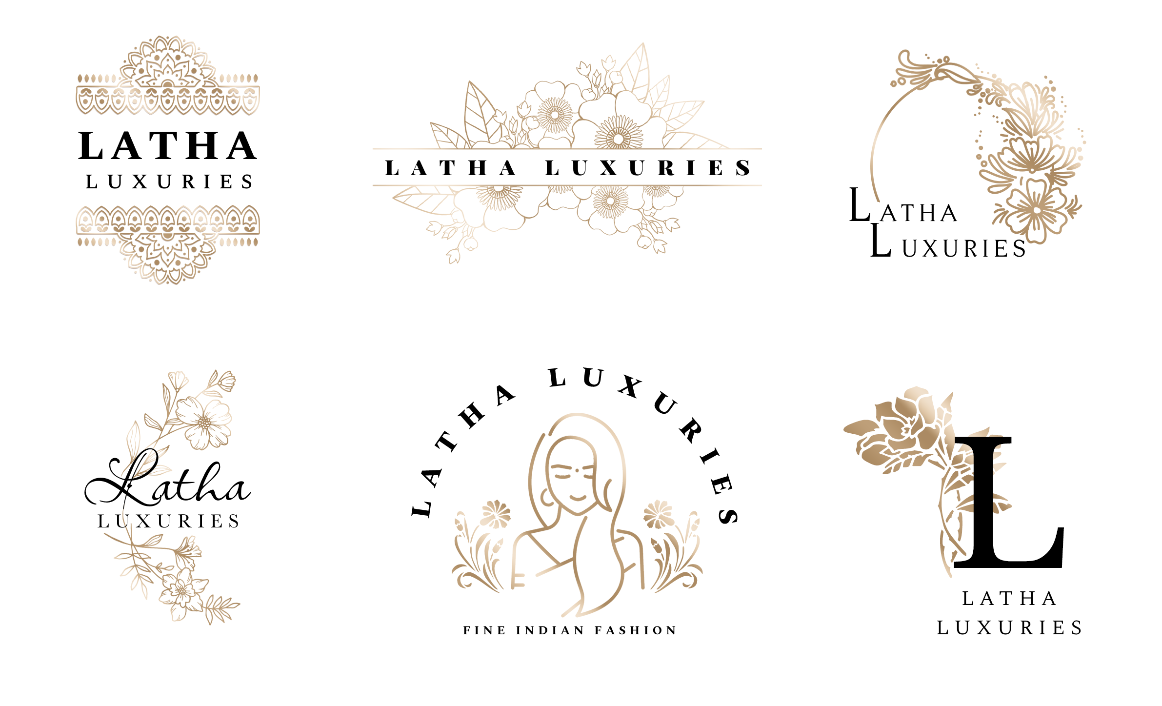 I first created 6 logo designs. For these logos, I wanted to portray a feeling of elegance and luxe. Playing off of what Latha means – flower – and Indian-inspired patterns, I selected henna-style floral motifs as the key graphic points. To add a sense of luxury and regalness, I used timeless serif fonts, as well as a minimal color scheme of black, white, and gold.