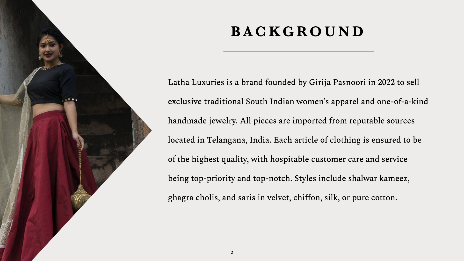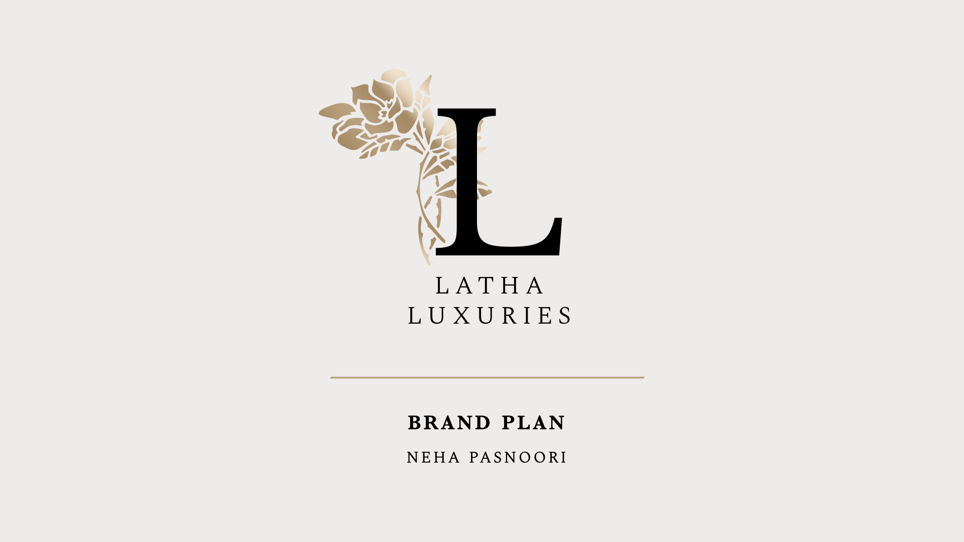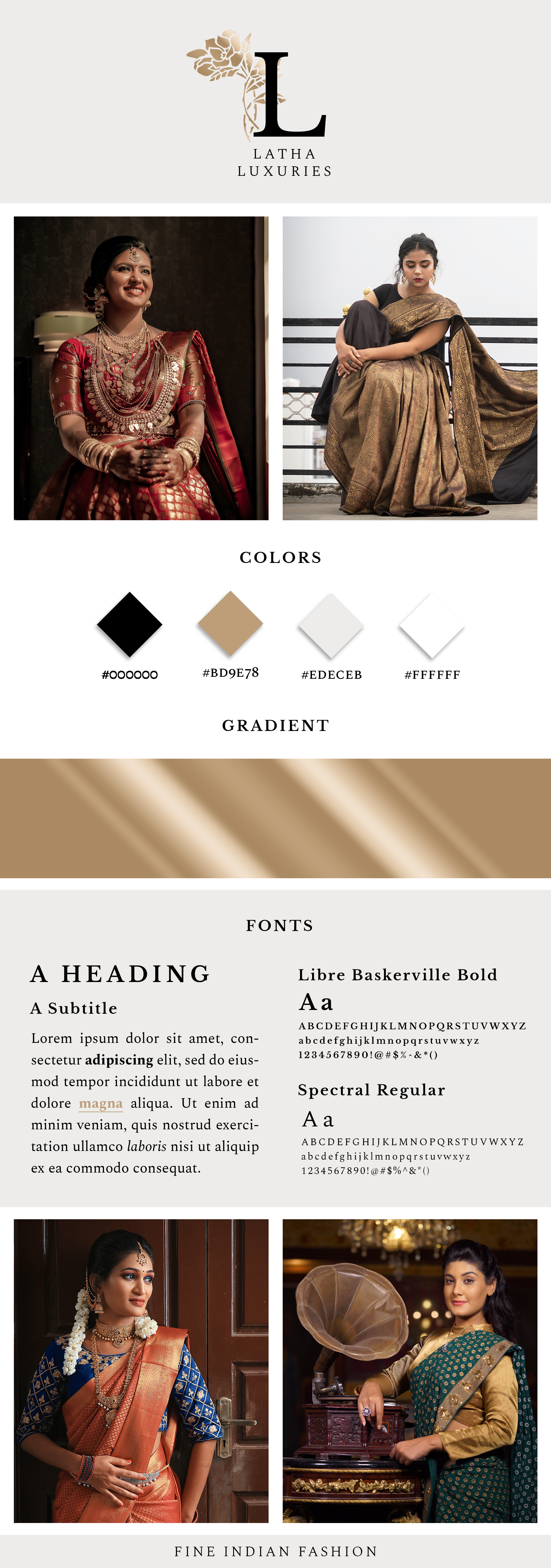 After designing the logos for Latha Luxuries, I moved on to create a moodboard. I hoped to keep branding sophisticated, timeless and universally appealing, as the customer age range for Indian fashion is quite wide. Therefore I used a neutral color palette with gold accents and two serif fonts.