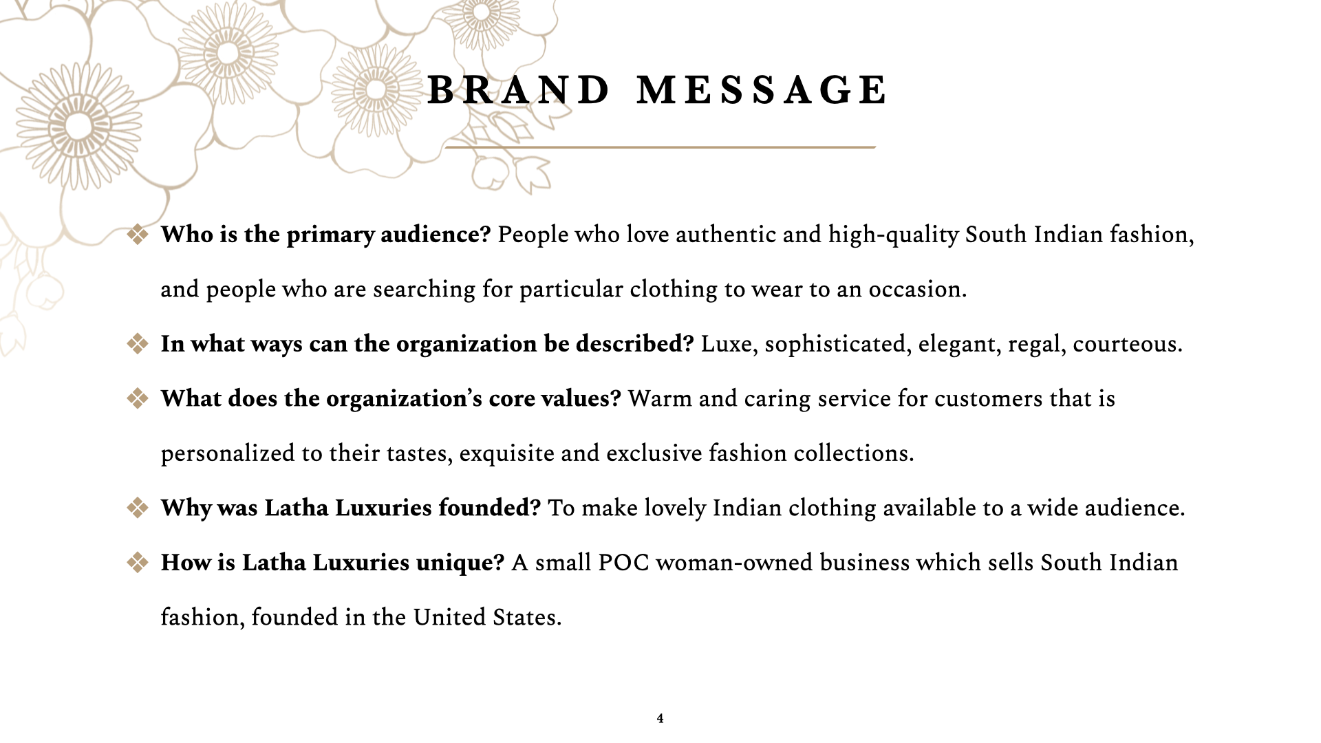 Finally, I put together a Latha Luxuries brand plan with the help of my prior research. Through competitive analysis, I was able to gage what the general audience would be like, how branding should be utilized, etc. In addition, I was able to derive a brand message using that information. I kept the layout of the brand plan itself cohesive to the main design that I defined in my moodboard.